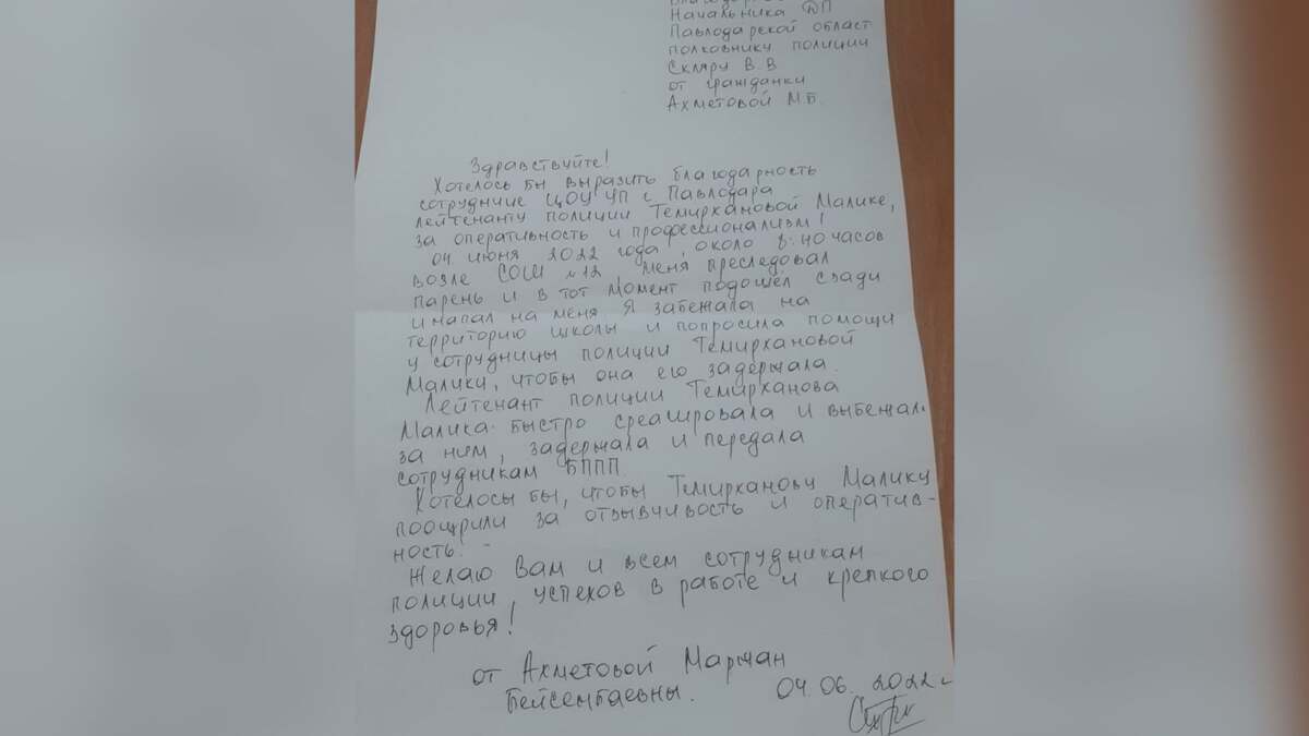 На имя начальника Департамента полиции Павлодарской области Василия Скляр поступило благодарственное письмо от жительницы города Павлодара Маржан Ахметовой. В своем письме горожанка выражает признательность за профессионализм и оперативность лейтенанту полиции Малике Темирхановой.
