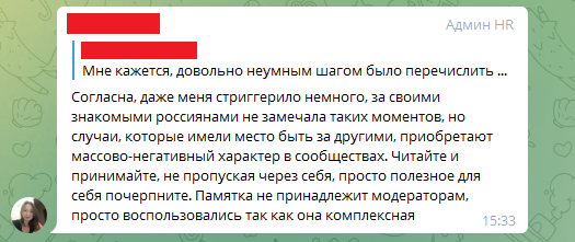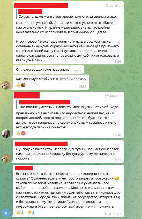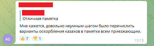 Данную пометку обсудили в Telegram-канале, посвященном миграции россиян в Казахстан. Там пользователи делятся советами касаемо жизни в нашей стране: социальная обстановка, получение гражданства, способы заезда в страну, заработные платы, аренда жилья, волокита с документами, вопросы бытового характера, статус русского языка и т.д. И данная заметка также не осталась без внимания.