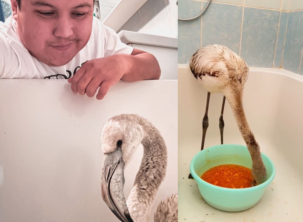 "В порту Актау заблудился очередной птенец фламинго, работники порта попытались его покормить самостоятельно, но не получилось. Везу малыша к себе домой, покормлю и отогрею", — подписал Азамат фото с еще одним потерявшимся фламинго.