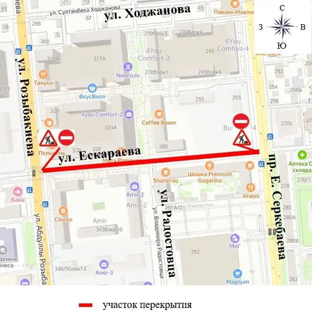 С 08:00 5 сентября до 06:00 9 сентября движение автотранспорта в Бостандыкском районе Алматы будет закрыто по ул. Ескараева – от пр. Е. Серкебаева до ул. Розыбакиева. Движение будет перекрыто в обе стороны.