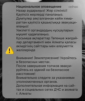 «Внимание! Землетрясение! Укройтесь в безопасных местах. После завершения толчков эвакуируйтесь из зданий на безопасное расстояние! Внимательно следите за указаниями уполномоченных органов. Дополнительная информация на сайтах и социальных сетях ДЧС и акимата г. Алматы».