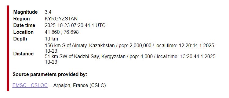 По данным Европейско-Средиземноморского сейсмологического центра подземные толчки были зафиксированы в 12.20 по времени Астаны на территории Кыргызстана, магнитуда 3,4.