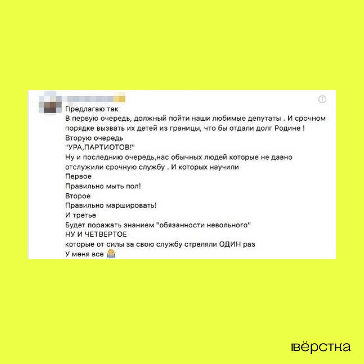 Люди предлагают отправлять на войну в Украине депутатов, их родственников и патриотов, которые наклеивали на свои машины букву "Z".