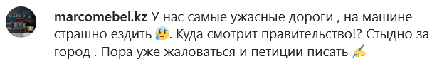В частности, их возмущает состояние дорог, передает медиа-портал Сaravan.kz со ссылкой на Ratel.kz.