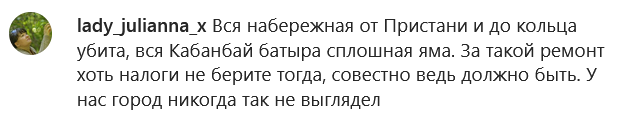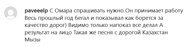 "Весь прошлый год я читал в новостях слова акима о том, что дороги ремонтируются, что он лично проверяет качество этого ремонта. И что я увидел этой весной? Яма на яме и ямой погоняет. От дома до школы, от школы до работы, затем назад вечером еду по часу-два, стараюсь объехать ямы, но это нереально, всю подвеску за неделю убил уже, всё хрустит и стучит. Знаете, сколько теперь запчасти стоят? Я работать на одну машину должен, что ли? А что детям кушать?" — комментирует ситуацию усть-каменогорец Женис Аркалыков.