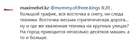 Жалобы в фото- и видеоформате непрерывно появляются в социальных сетях. Отмечают отсутствие снегоуборочной техники, а также то, что тяжелой работой по сгребанию снега занимаются пожилые женщины.