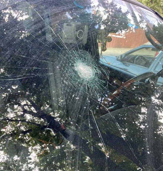"Сегодня сотрудница ехала по улице Рыскулова, на пересечении с улицей Розовой произошла перестрелка, и одна пуля попала в машину сотрудницы, скорее всего, стреляли из травмата. Позже там все оцепили сотрудники полиции…" — рассказали в посте и приложили фотографии.