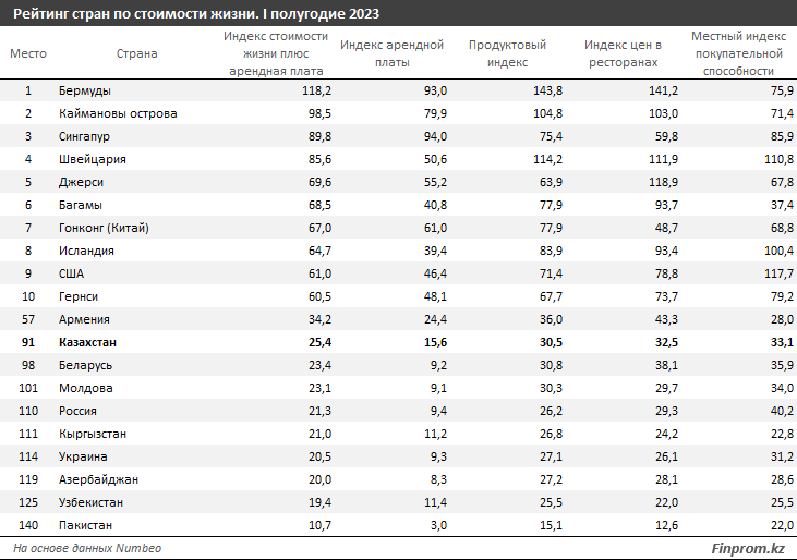 В рейтинге стран по стоимости жизни, который составили по итогам первого квартала 2023 года, Казахстан оказался на 91-м месте, передает Сaravan.kz со ссылкой на Finprom.kz.