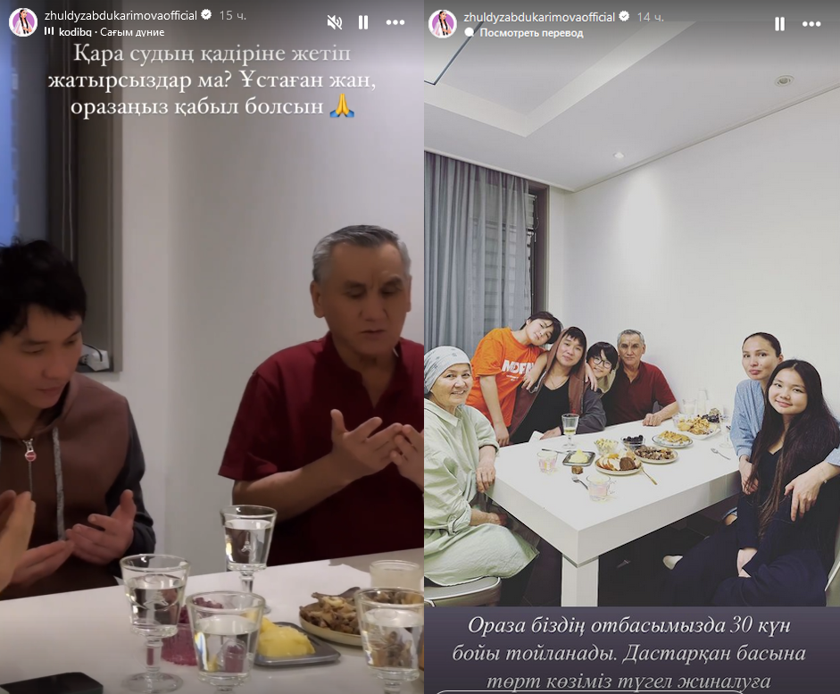Однако на первый день оразы она выбралась к семье, сообщает Caravan.kz. Жулдыз показала, как сидит за столом с родителями, детьми и супругом — Кайратом Нуртасом.