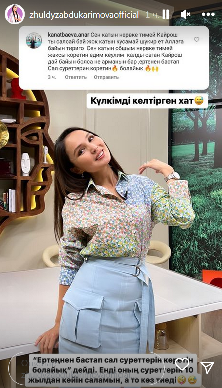 Об этом звезда рассказала в своем Instagram, сообщает медиа-портал Сaravan.kz. Одна из фанаток Кайрата Нуртаса написала Жулдыз текст, который актриса опубликовала в своих сториз с подписью "Рассмешившее меня сообщение".