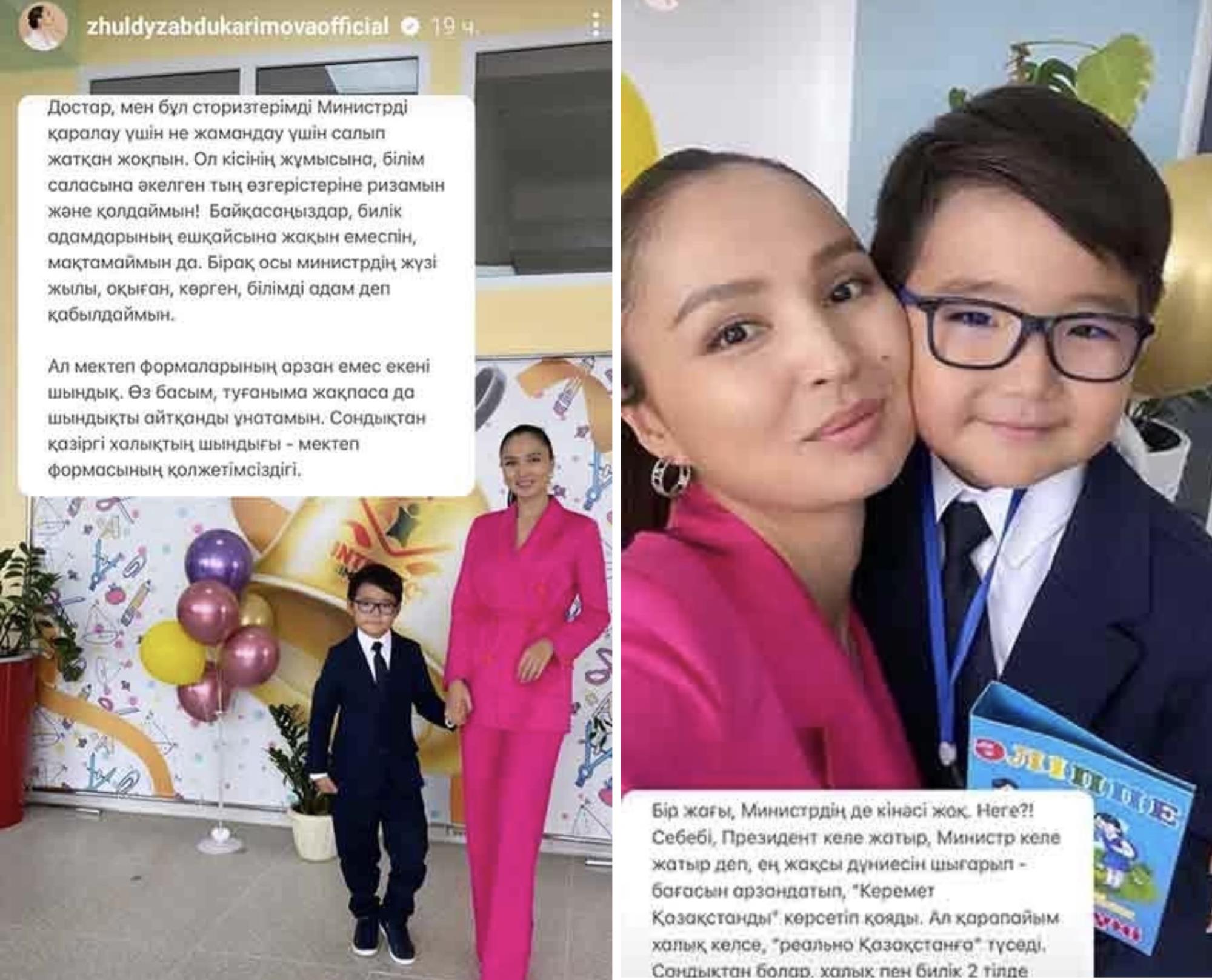 "Друзья, я пишу эти истории не для того, чтобы оклеветать или выставить в плохом свете министра. Я благодарна ему за работу и поддерживаю изменения, которые он внес в сферу образования. Если вы заметили, я не связана с людьми у власти и никого из них не нахваливаю. Но лицо этого министра выдает в нем человека теплого, образованного, проницательного, умного, и таким я его считаю. А то, что школьная форма стоит недешево, — это правда. Лично я предпочитаю говорить правду в любом случае. Таких образом реальность нынешних людей — малодоступность школьной формы. С одной стороны, министр тоже не виноват. Почему?! Потому что когда приезжает президент или министр, им показывают лучшее, снижают цены и устраивают шоу "Чудесный Казахстан". А обычные люди приезжают в "реальный Казахстан". Так и получается, что народ и власть как будто говорят на двух разных языках и живут в двух разных странах…" — написала она.