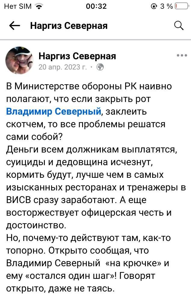 Супруги Северные были арестованы 20 апреля текущего года на глазах у трех своих детей по обвинению в вымогательстве. При этом буквально накануне Наргиз писала в социальных сетях, что в адрес Владимира поступают угрозы, связанные с его статьями об армии РК.