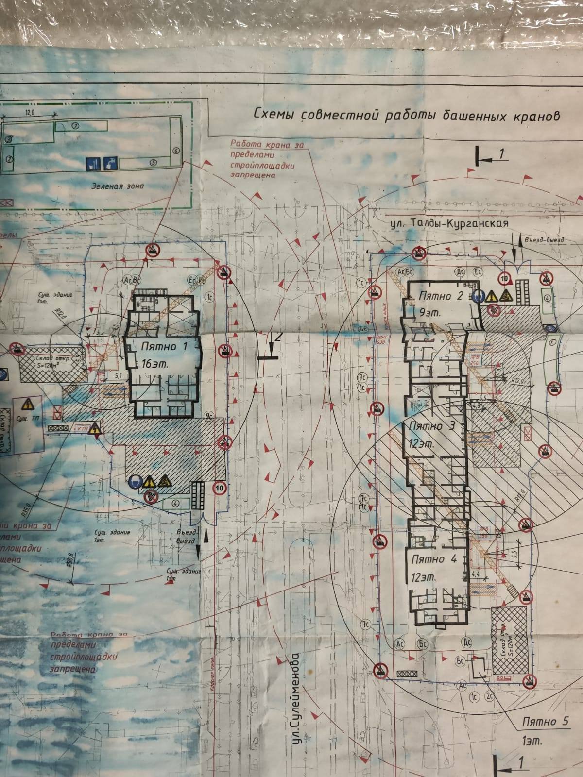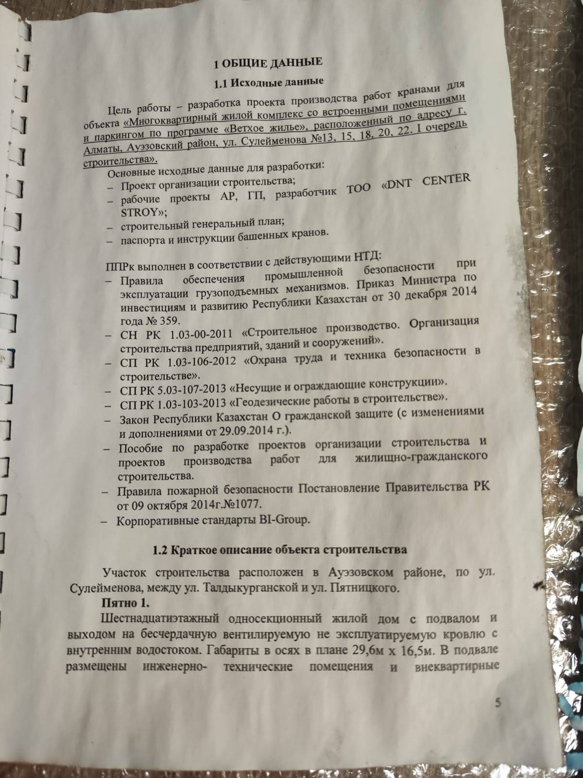 С любопытством стала изучать бумаги, среди которых были наряды-допуски на производство повышенной опасности, журнал регистрации инструктажа по безопасности и охраны труда на рабочем месте, планы совместных мероприятий по безопасности и охране труда на объектах BI GROUP, вахтерный журнал крановщика, схемы совместной работы башенных кранов и проект производства работ кранами. Так вот в последнем документе указано, что объект, на котором работали строители, назывался «многоквартирный жилой комплекс со встроенными помещениями и паркингом по программе «Ветхое жилье», расположенный по адресу г. Алматы, Ауэзовский район, ул. Сулейменова №13,15,18,20,22, 1 очередь строительства». Какое отношение к ветхому жилью имеет детский сад по адресу Сулейменова 11, неизвестно. Но в проекте производственных работ кранами четко сказано, что на месте садика должен быть