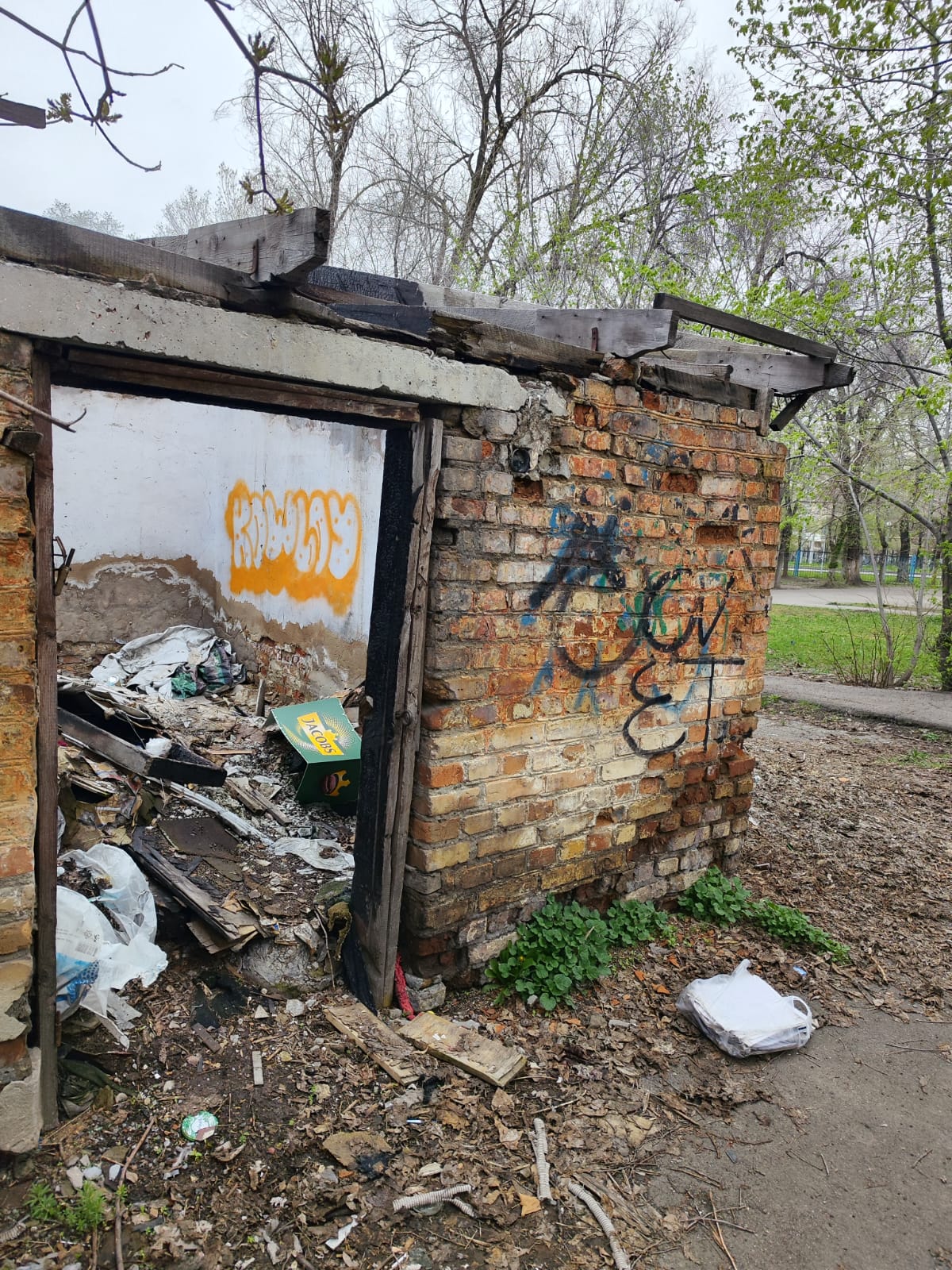 Между блоками бывшего садика есть разрушенная хозяйственная постройка, которую превратили в свалку ненужных вещей. И, судя по всему, ее тоже поджигали. Обугленные балки и косяки, графити на кирпичной стене этого сарая дополняли и без того жуткую картину. Рядом под кустом лежал ковер, пустые бутылки, чуть дальше от них относительно свежий матрац. Видимо, местные маргиналы устроили здесь лежбище.