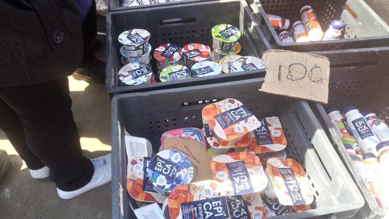 Как всегда, увидела очереди за товаром с истекающим сроком годности и просроченным ( «просрочкой») — сладостями, йогуртом, макаронами, лапшой, подсолнечным маслом, майонезом, оливками, солеными огурцами, кукурузой и зеленым горошком в банках, кофе. Их продавали на улице с прицепа, а также внутри рынка.