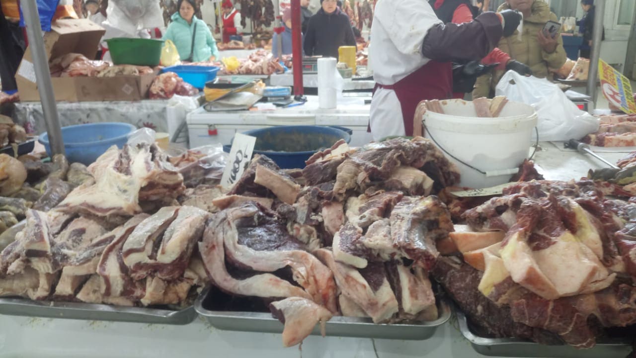 Ну а я отправилась дальше, в мясной павильон. Не скажу, что здесь ажиотаж. Покупатели есть, но очередей за казы, жая, кониной, говядиной я не увидела. У девушки в шикарных национальных украшениях купила молодую баранину по 2600 за килограмм.