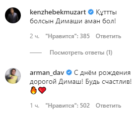 Артур Пирожков в числе других знаменитостей поздравил казахстанского певца с днём рождения на его странице в Instagram, передаёт медиа-портал Сaravan.kz.