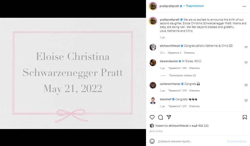 42-летний американский актер Крис Пратт и его жена, 32-летняя писательница и дочь Арнольда Шварценеггера Кэтрин Шварценеггер, вновь стали родителями. Об этом супруги сообщили в своем Instagram-аккаунте, пишет Lenta.ru