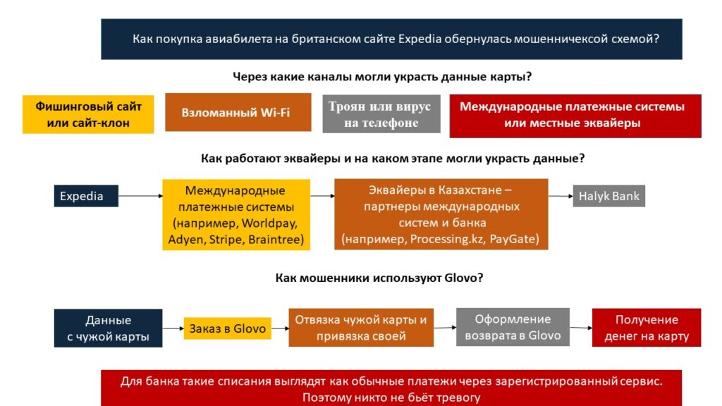 Андрей подозревает, что всё началось за день до инцидента, когда он купил авиабилеты на британском сайте Expedia. Он ввёл данные карты на открытой странице. На следующий день их уже использовали мошенники. Важная деталь: на сайте не нужно было предварительно регистрироваться. Достаточно было указать мобильный телефон, электронную почту и данные карты. Это очень странно для такого крупного агрегатора. Так что же произошло? Попробуем разобраться.