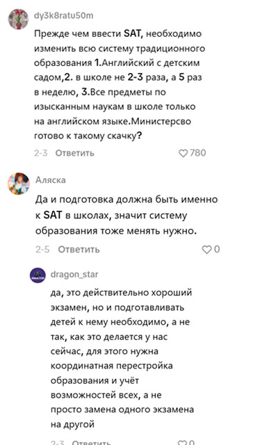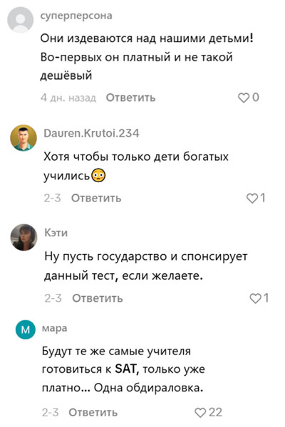 Особенно показательно звучат комментарии из регионов: «Света нет, воды нет. Какой SAT?». Это говорит о колоссальном разрыве между городом и селом. SAT изначально завязан на академический английский, на развитую инфраструктуру, на культуру эссе и подготовки. В условиях, где даже базовая школа неравномерна по качеству, внедрение такого формата может больно ударить по образованию в регионах.