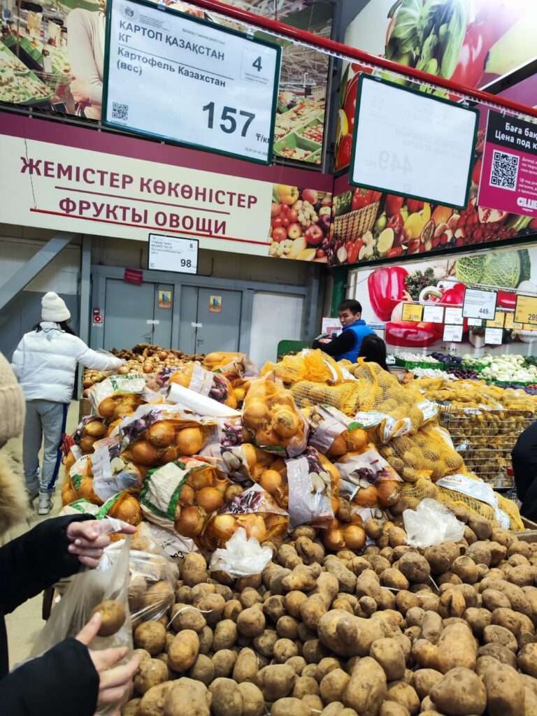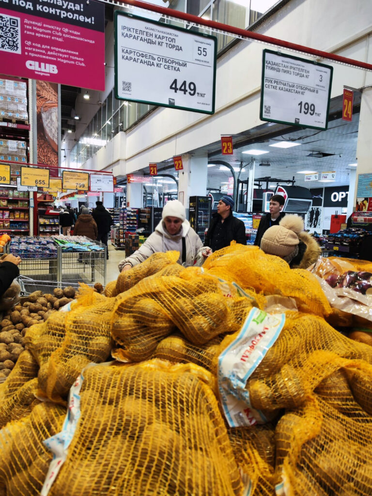 Рядом — ровный карагандинский картофель в сетке. Цена – 445 тенге за килограмм. Хочешь — ешь, хочешь — любуйся прямо сквозь сетку.