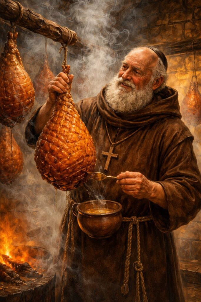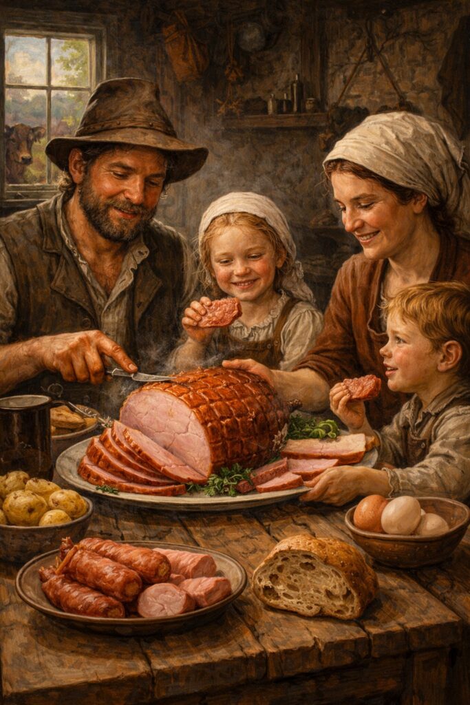 В Европе вплоть до начала ХХ века ветчина считалась обязательным праздничным блюдом на двух праздниках — Пасхе и Рождестве. Забивали же свиней обычно в конце октября, перед первыми заморозками. Холодильников тогда ещё не было, в погребах стояла плюсовая температура, а во многих регионах ноябрь мог выдаться довольно жарким. Тем не менее ветчина совсем не портилась. Более того, считалось, что окорок будет готовым только через 16 месяцев. То есть, засаливая и коптя мясо на октябрьский праздник урожая, крестьянин надеялся полакомиться этой ветчиной только к Рождеству следующего года, а то и к Пасхе. В среднем же окорока хранились три года, но и через пять лет были вполне съедобны.