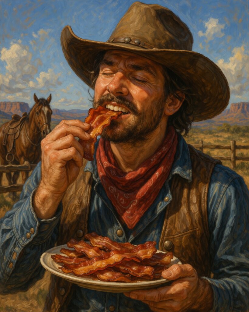 Деградация колбасных изделий началась с бекона. Бекон стал популярен у американцев со времен покорения Дикого Запада. Этот продукт был дёшев, не занимал много места в дорожной сумке, калориен и, что самое главное, долго не портился. За эти качества бекон и полюбили ковбои. Его можно было есть как сырым, так и поджаренным на костре, быстро обеспечив себя ароматным горячим блюдом. Климат в американских прериях очень похож на климат казахстанских степей. Летом жара тут стоит невероятная. При этом кусок бекона может лежать в сумке по несколько месяцев и только становиться вкуснее. С нынешним продуктом из супермаркета такой номер не пройдёт. Даже если не снимать вакуумную упаковку, бекон на жаре станет скользким и безвкусным, а если его просто завернуть в бумагу и кинуть на дно сумки, как это делали бравые ковбои, то кусок сала посереет и буквально через час станет издавать такой аромат, что стошнит даже стервятников.