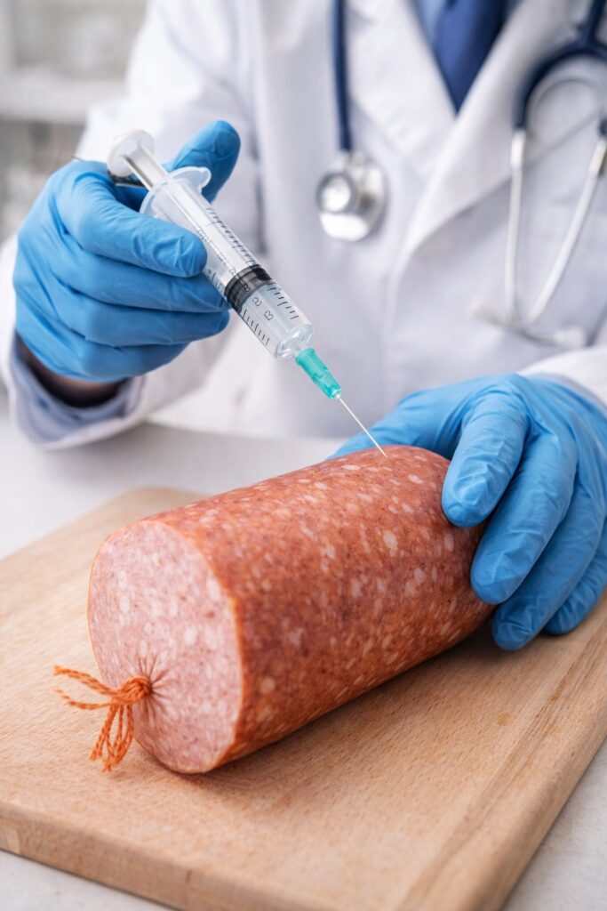 Самый большой показатель активности воды в естественных условиях наблюдается в куске сырого мяса на жаре. Это идеальная среда для размножения стафилококков, такой показатель равен 0,98. Большинство опасных для здоровья микроорганизмов, таких как стафилококк, листерия и кишечная палочка погибают при показателе 0,92. В беконе, сделанном по современной технологии, то есть напичканном водой через инъекции, показатели активности воды 0,95-0,96. Другими словами, он мало чем отличается от куска гнилого мяса посреди помойки. Если оставить все как есть, то уже через минуту после вскрытия вакуумной упаковки или минут через пять после того, как колбаска из холодильника окажется на столе в теплой кухне, еда превратится в настоящую отраву, и бутерброд станет последним в жизни. Производители дрянных колбасных продуктов об этом знают. Хоть они и не заботятся о здоровье покупателя, травить клиентов до смерти им тоже не хочется. Поэтому в колбасные изделия добавляются дешевые консерванты, от относительно безвредного, но придающего неприятный вкус, бензойнокислого натрия до токсичной селитры. От такой дряни прочь бегут даже болезнетворные бактерии.
