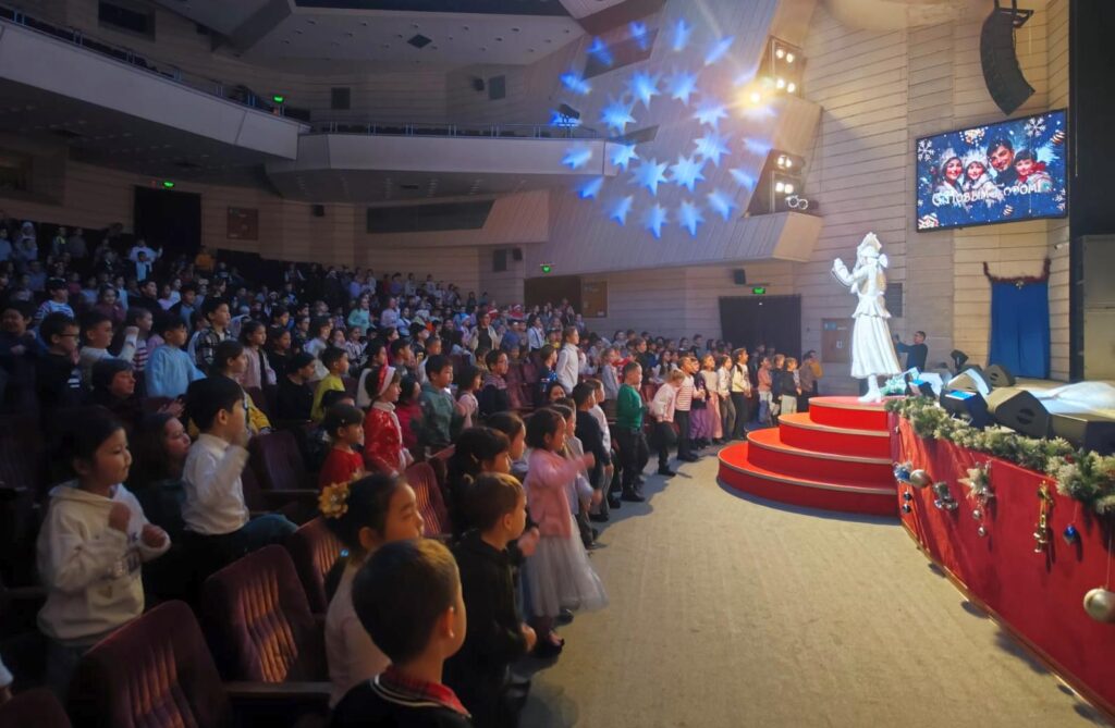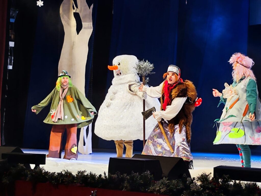 Фойе театра встречает гостей праздничной атмосферой: украшенная елка, тематические зоны и персонажи из сказок сразу создают настроение праздника.