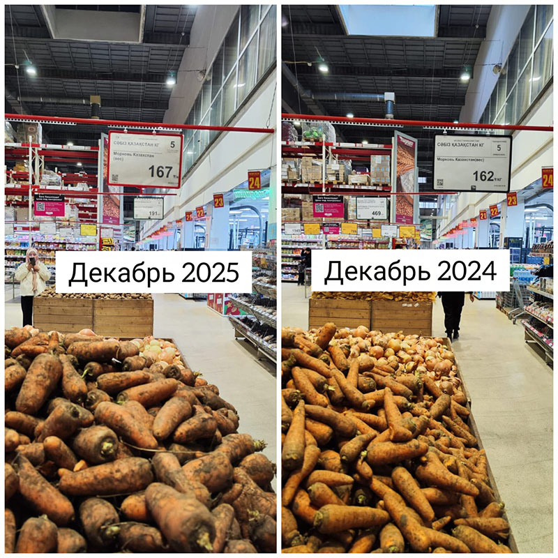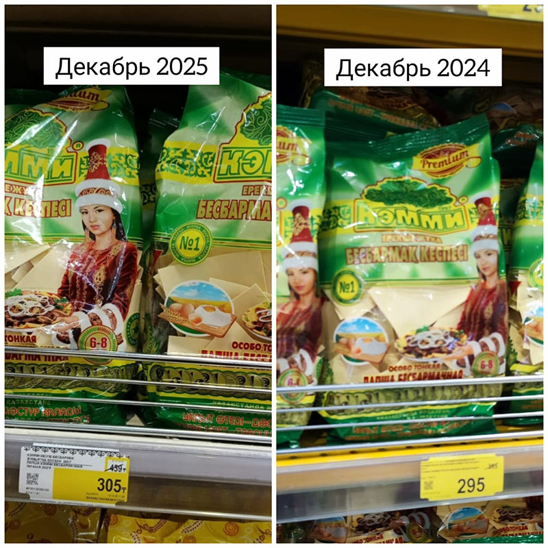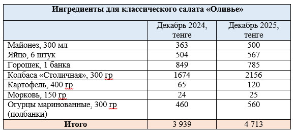 Когда всё это пересчитали на граммы и столовые ложки, получилась следующая картина: прошлой зимой оливье обходился в 3 939 тенге, в этом году — уже 4 713. Рост на 20 %.
