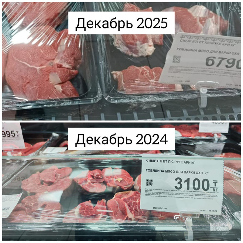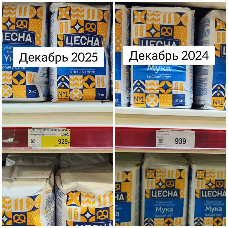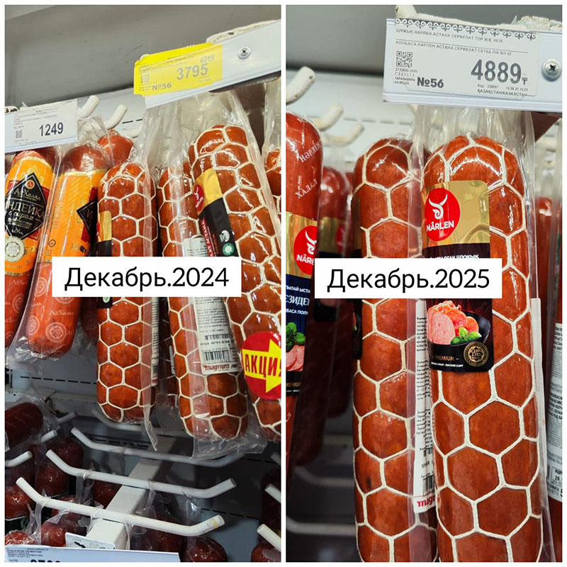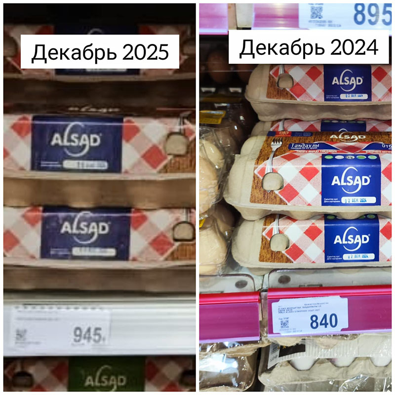 Говядина и вовсе стала элитным продуктом, в супермаркетах она подорожала в два раза по сравнению с прошлым годом. Лук вырос в цене на 8,5 % (был 105 тенге, стал 114). Даже яйца, ещё вчера казавшиеся стабильными, подорожали с 840 до 945 тенге за десяток. Двухкилограммовую пачку муки высшего сорта «Цесна» в декабре 2024 продавали по 939 тенге, сейчас ее можно купить со скидкой по 929 тенге. Соль, перец и лаврушку мы даже не брали в расчет.