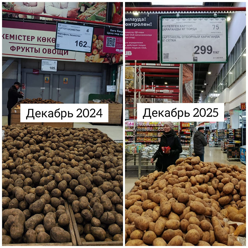Картофель сейчас стоит 299 тенге, в декабре прошлого года его продавали по 167. Яйца будто следили за прогнозами Нацбанка (рост на 12 %). А вот зеленый горошек местами даже подешевел из-за новогодних скидок с 849 до 785 тенге.