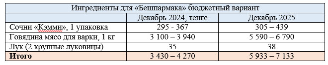 Можно, конечно, попытаться приготовить бюджетную версию блюда. Купить готовые сочни, убрать из рецепта казы и жая, оставить один вид мяса. Но даже такой облегчённый вариант подорожал с 3,4 тыс. тенге почти до 6 тыс. тенге (в два раза).
