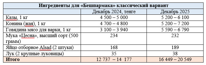 Когда мы аккуратно собрали весь набор ингредиентов и перевели всё в граммы и порции, то оказалось, что классический бешбармак в прошлом году стоил примерно 12-14 тыс. тенге. В этом году — от 16 до 20 тыс. тенге. В зависимости от мяса и магазина — рост от 29 % до 45 %!
