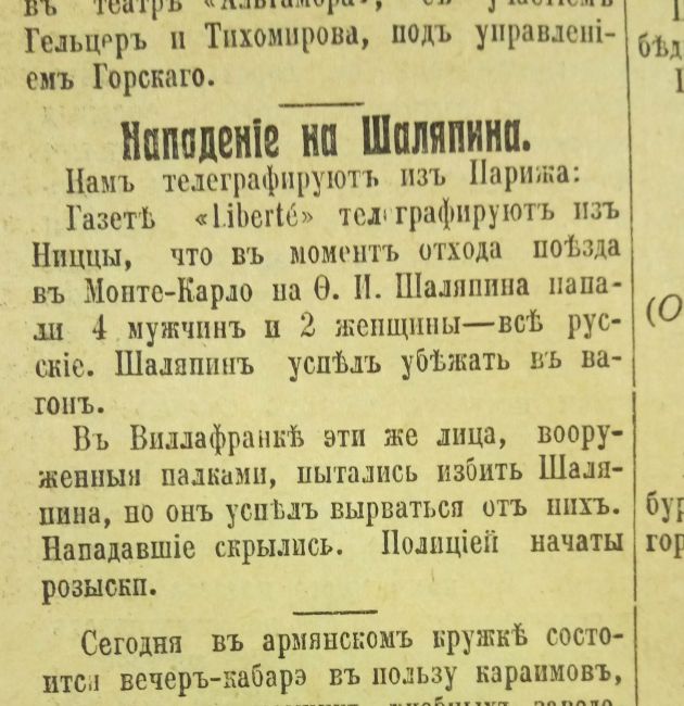 Так, в одной из питерских газет 1911 года есть любопытная заметка, как подгулявший купец увидел на улице Федора Шаляпина и кинулся на него с кулаками. Городовым же купец заявил, что захотел как следует проучить шельму, а за что именно, сам толком не знает.