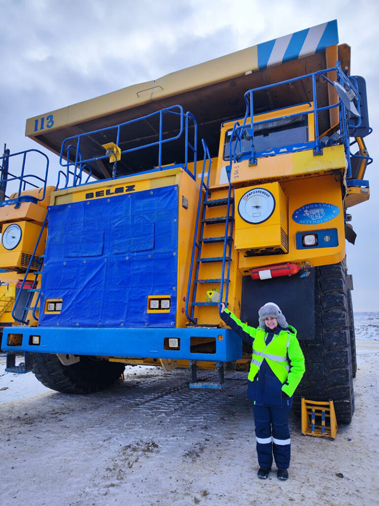 На карьере я, разумеется, не работала, поэтому для меня эта поездка стала редкой возможностью прикоснуться к горнорудной отрасли. Увидеть, как проходят взрывные работы, как грузят руду и как выглядят вблизи карьерные самосвалы, у которых одно колесо выше меня ростом.
