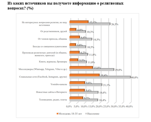 Современные реалии меняют и источники информации. Если раньше новости о духовной жизни приходили через мечети, церкви или телевизор, сегодня всё чаще люди ищут ответы в Интернете — в YouTube, Instagram, Telegram. Эксперты отмечают, что именно там активнее всего транслируют радикальные идеи. Социологи указали в исследовании, что молодежь чаще всего оказывается в зоне риска распространения деструктивных религиозных движений. Каждый второй респондент считает, что радикальные идеи особенно легко приживаются среди молодых из-за безработицы, социальной неустроенности и низкой религиозной грамотности. Поэтому важно создавать качественный контент о религиозной культуре и толерантности, особенно для молодых пользователей.