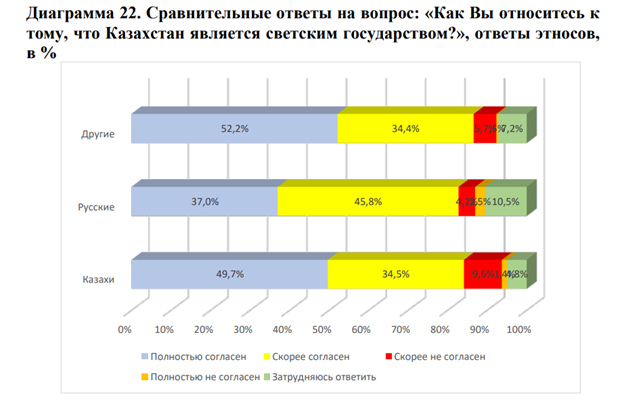 Данные по этому поводу были опубликованы в аналитическом отчёте «Оценка государственной политики в религиозной сфере населением Казахстана», подготовленный в 2024 году MLGroup для Комитета по делам религий. В результате соцопроса было выявлено, что 83 % казахстанцев считают религиозную ситуацию благополучной, а почти 90 % поддерживают курс государства на сохранение светского характера страны. Вера для большинства — личное дело, а политика, по мнению большинства респондентов, должна оставаться политикой.