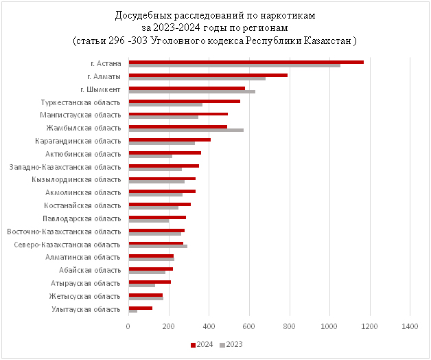 Больше всего досудебных расследований по наркотикам зафиксировано в Астане — 1 170 за 2024 год. Это на 119 больше, чем в 2023-м. Алматы тоже показывает уверенный рост с 679 до 788 случаев. И это понятно: большие города, большие деньги, большие риски. Граница между легальной аптекой и тёмным телеграм-каналом всё тоньше. Но в последнее время стали удивлять регионы. Не в лучшем смысле.