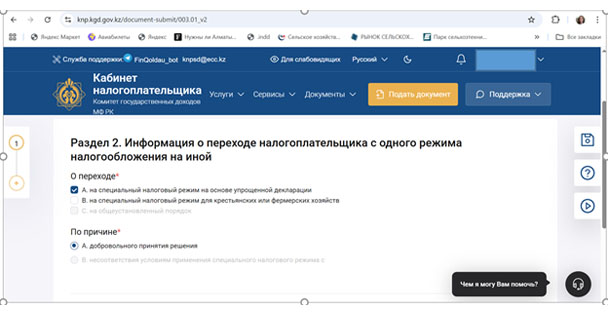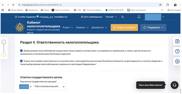 • Подтвердить, что вы несёте ответственность за достоверность и полноту предоставленных сведений. А также то, что режим будет применяться в соответствии с Налоговым кодексом. Ниже следует отметить, к какому органу государственных доходов вы относитесь. Как правило, он зависит от места регистрации бизнеса. После нужно нажать кнопку «Сформировать».