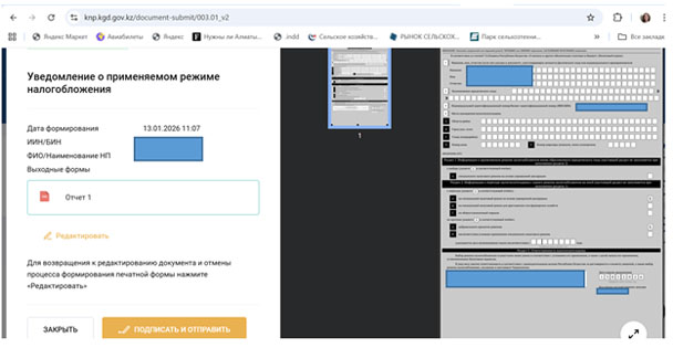 • После того, как выскочит уведомление о применяемом режиме налогообложения, в документе нужно проверить все данные. Если что-то указано некорректно, отредактировать. Затем подписать и отправить с помощью ЭЦП.