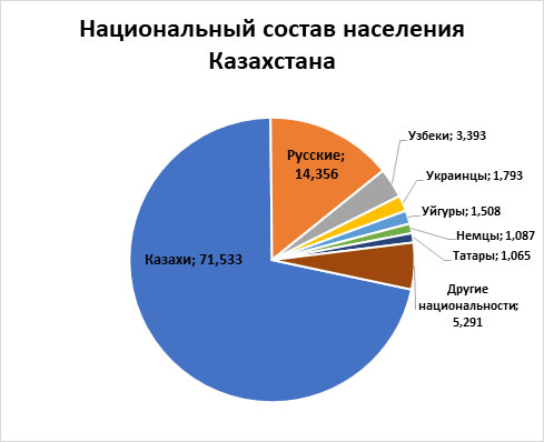 Самые большие национальные группы – это казахи (71,5 %), русские (14,4 %), узбеки (3,4 %), сообщает Caravan.kz.