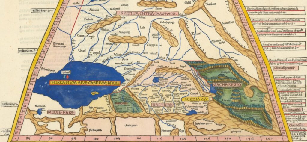 На карте Клавдия Птолемея есть широта и долгота, но по контурам Каспийского моря можно заметить, насколько она неточна. Изображение «Атлас Птолемея»