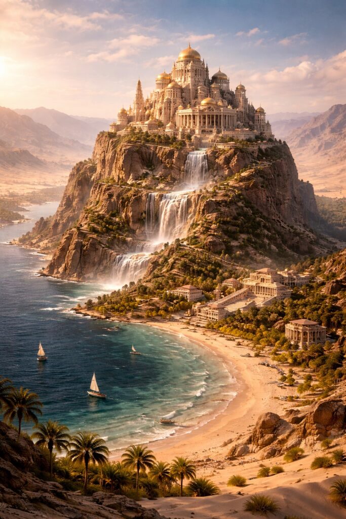 Своему процветанию город-государство Аспабота обязан удачному расположению на стыке морских и сухопутных путей. Изображение сгенерировано нейросетью
