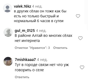 Что касается регионов, то жалоб на сервисе практически нет. Но это не значит, что Интернета там в избытке. В некоторых уголках страны его просто нет. Например, в октябре в СМИ прошла информация, что в восточных районах Казахстана сотни жителей до сих пор остаются без Интернета. В Маркакольском районе, в приграничном регионе страны, телефоны абонентов вообще ловят сигнал китайских операторов. Комментаторы в соцсетях пишут, что в других сёлах скорость Интернета бывает только по шесть часов в день. А в Алтайском районе доступа ко Всемирной паутине в ряде сёл нет вовсе.