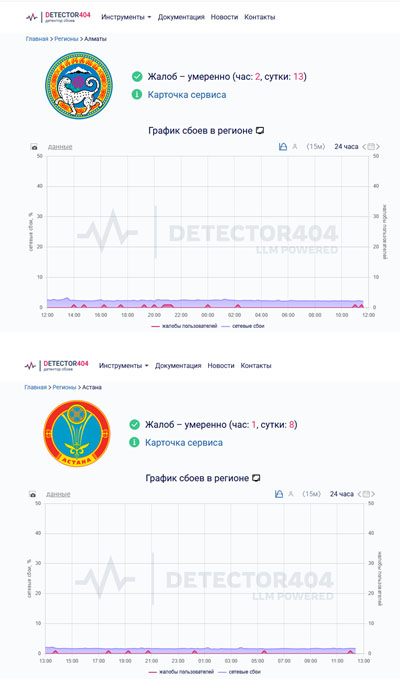 Начнем с мегаполисов. 17 ноября в городах Алматы и Астана наблюдались частые сбои интернета в дневное и вечернее время. Сервис мониторинга сбоев и доступности сайтов Detector404.kz зафиксировал резкие падения скорости, а абоненты жаловались на невозможность выйти в сеть, смотреть видео или работать онлайн.