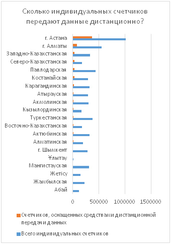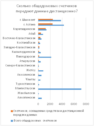 Особенно продвинутыми оказались потребители в Астане: почти каждый третий индивидуальный счётчик — с удалённой передачей. В Алматы — только 13 % (из 546 тысяч приборов — 74 тысячи дистанционных). В Карагандинской области 4,7 % индивидуальных счетчиков могут передавать данные. А вот с общедомовыми счётчиками карагандинцы, наоборот, молодцы. Из 1 378 приборов аж 1 237 — умные. Видно, серьёзно подошли к вопросу.