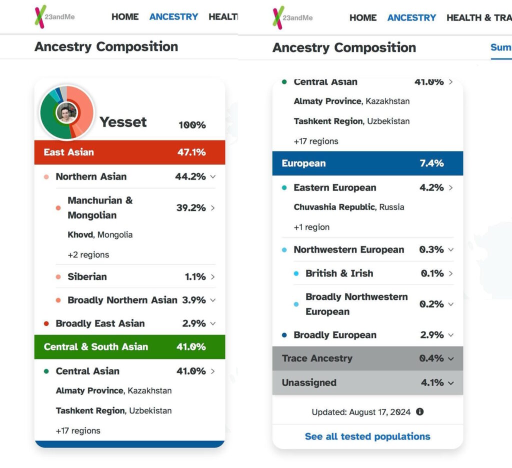 Еще один пользователь попробовал сделать тест с помощью сайта 23andMe, который стал очень популярен в Америке в последние годы. Более 47 % его генов сайт посчитал восточноазиатскими, причем почти 40 % пришлось на маньчжуров и монголов. Еще 41 % ожидаемо составили центральноазиатские гены. Меньше всего – 7,4 % – пришлось на европейские гены. 4,1 % проверка идентифицировать не смогла.