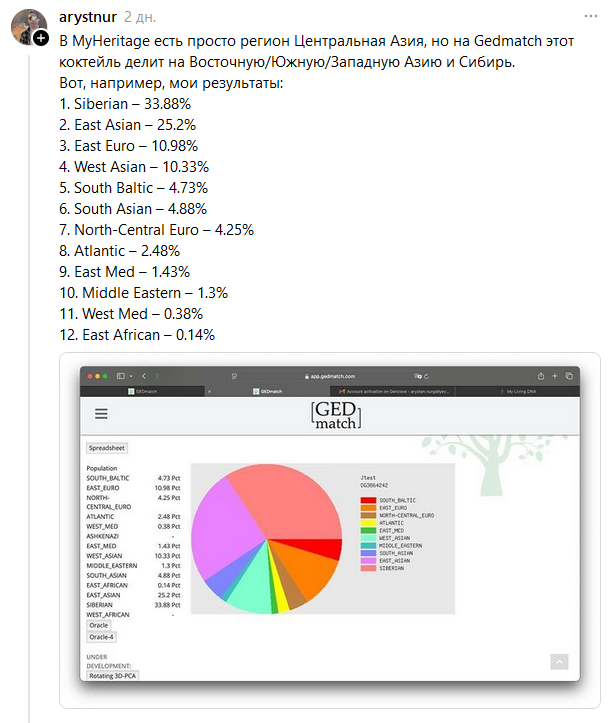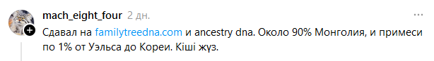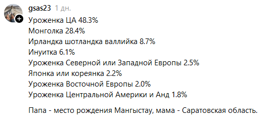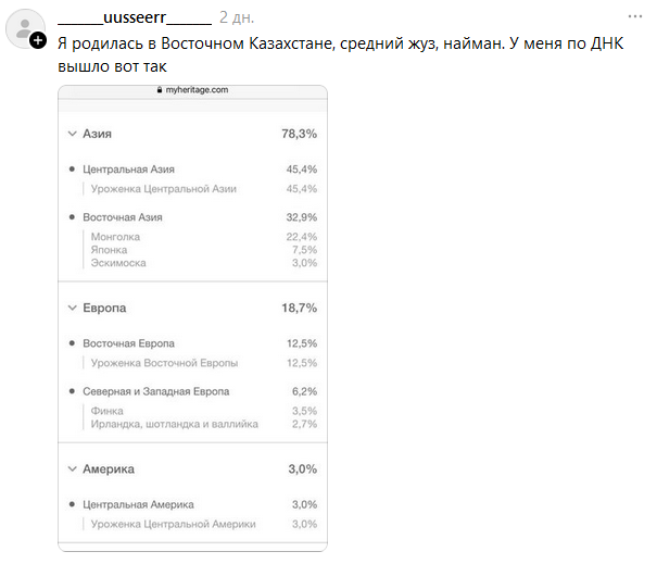 «Казахи, кто-то сдавал ДНК тест на этнические маркеры? Где сдавали? Довольны ли детализацией? Я раньше думала, что ничего интересного не увижу там: монголы в основном и татары, турки, русские по чуть-чуть. А побывав на востоке и юге Азии, поняла, насколько у нас шире диапазон роста, оттенка кожи, цвета глаз, волос, формы носа, лица, довольно разношерстная нация в сравнении с более гомогенным Дальним Востоком и Юго-Восточной Азией. И стало интересно, ведь действительно сердце Евразии — Шелковый Путь», – написала пользовательница под ником vatarolla.