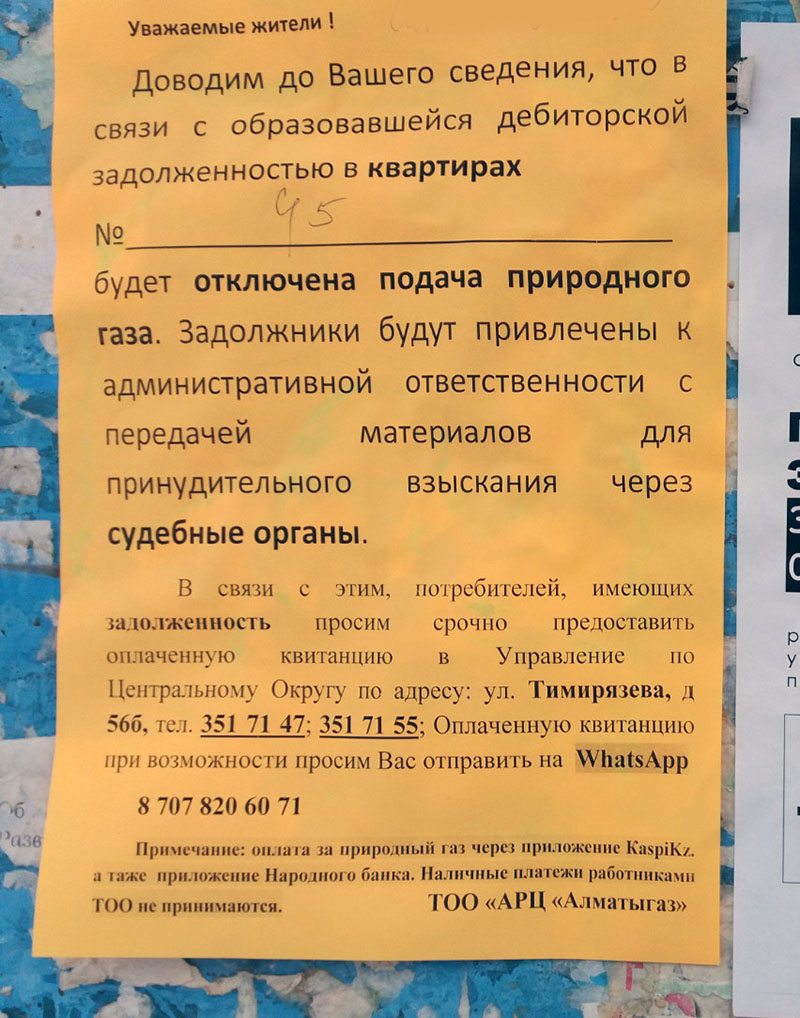 Мы попробовали связаться с ТОО «АРЦ «Алматыгаз» по телефонам из объявления, но они молчат – никто не взял трубку в рабочее время. Как они собирались дать возможность связаться с ними по этим контактам должникам и их добросовестным соседям, которые захотят задать им вопросы, — неизвестно.